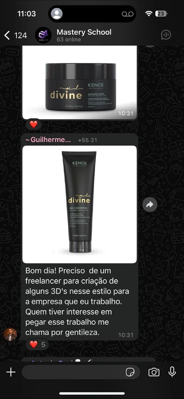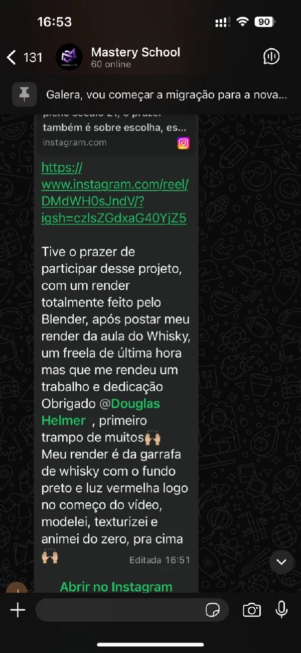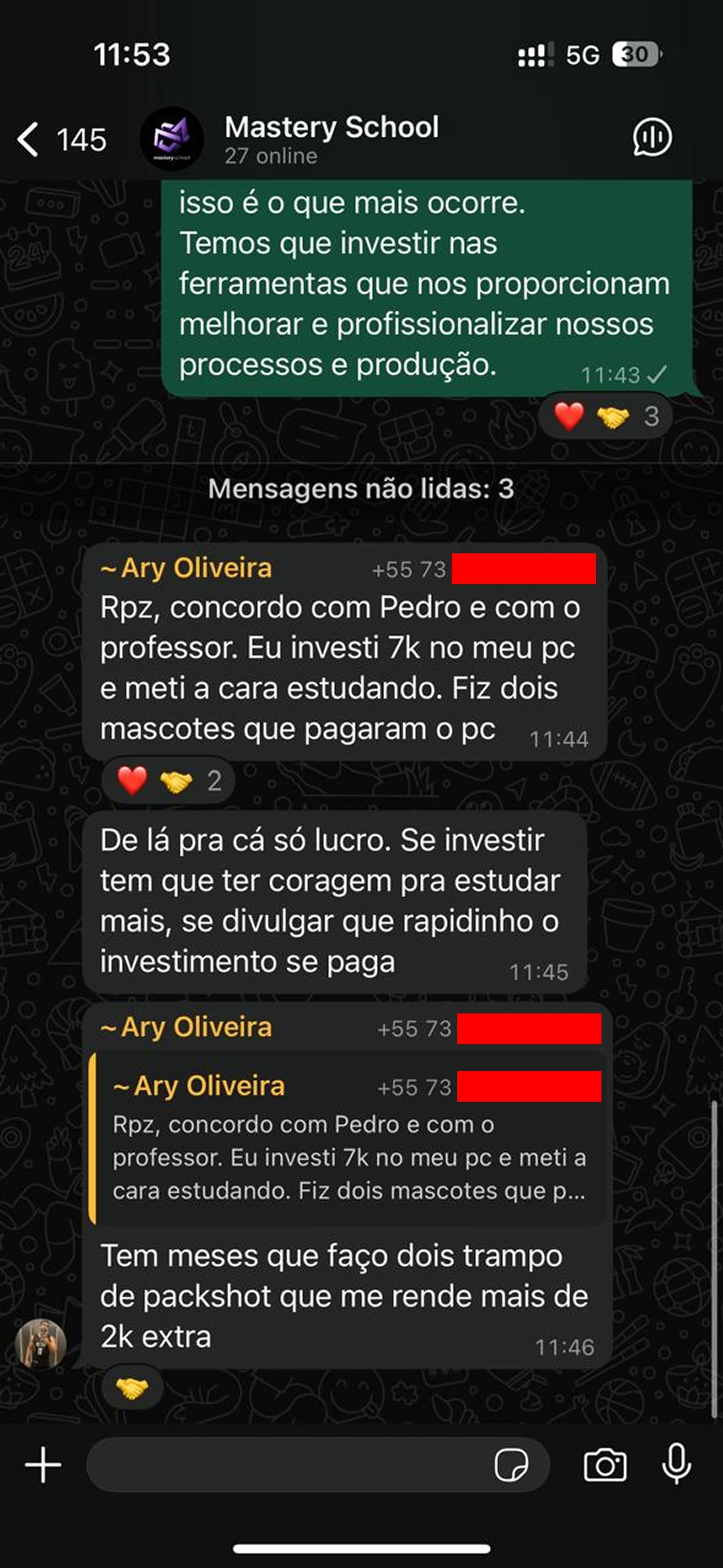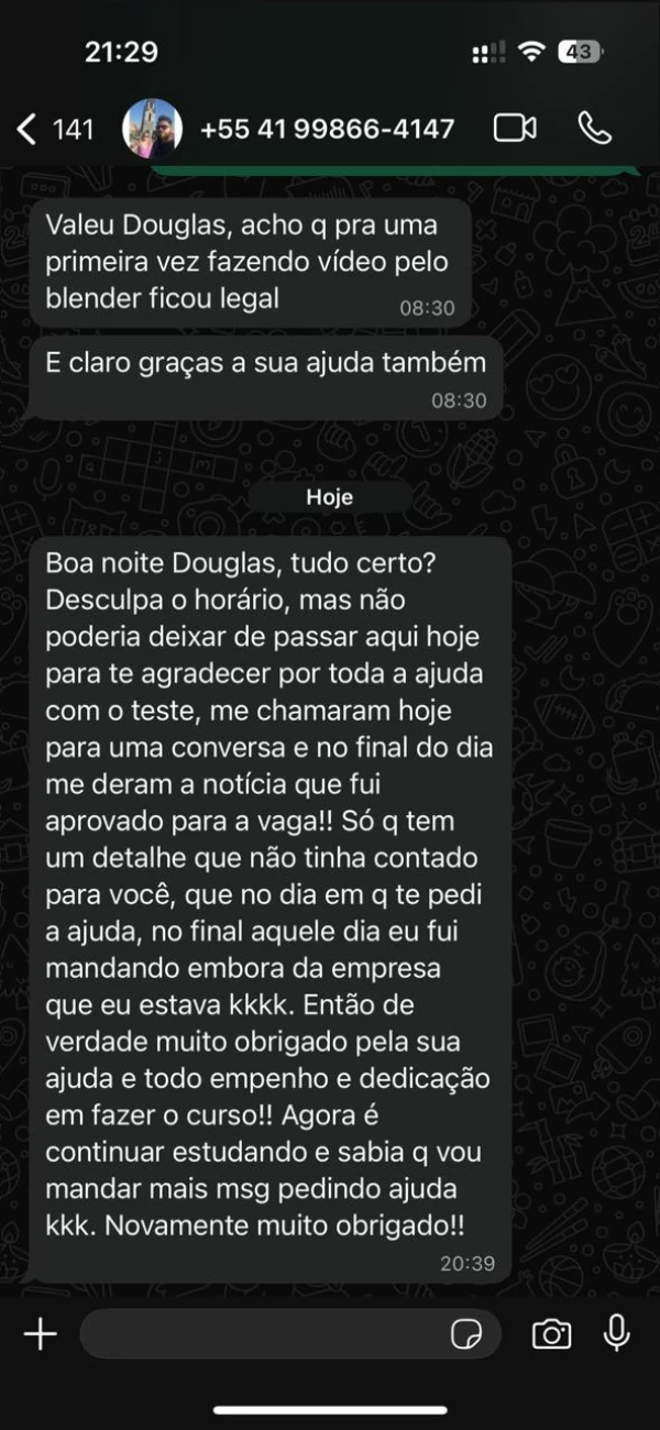 Comunidade de alunos no whatsapp e discord para fazer network, trocar experiências, tirar dúvidas, compartilhar projetos e o mais importante, ter acesso ao professor e vagas de freelas que são enviados.