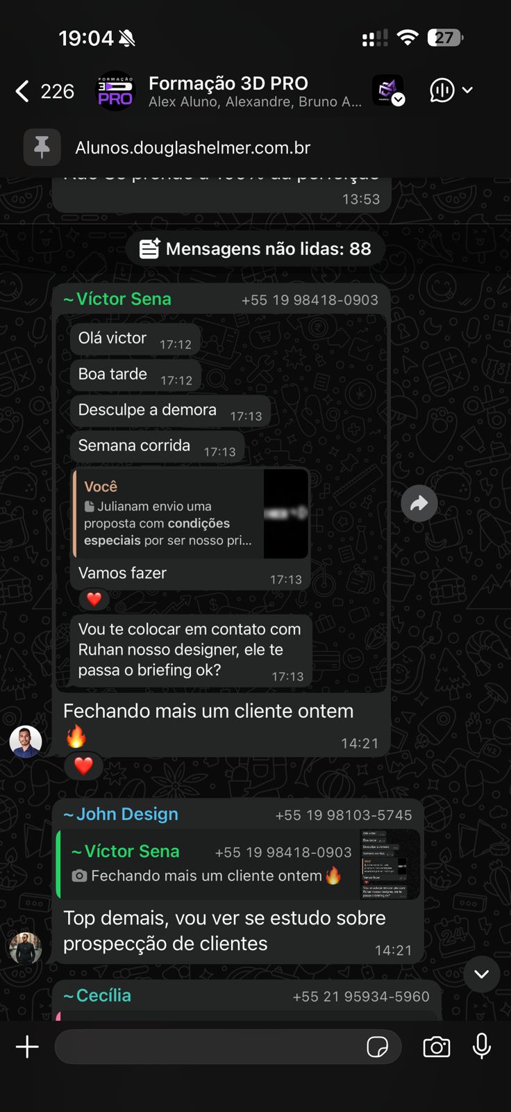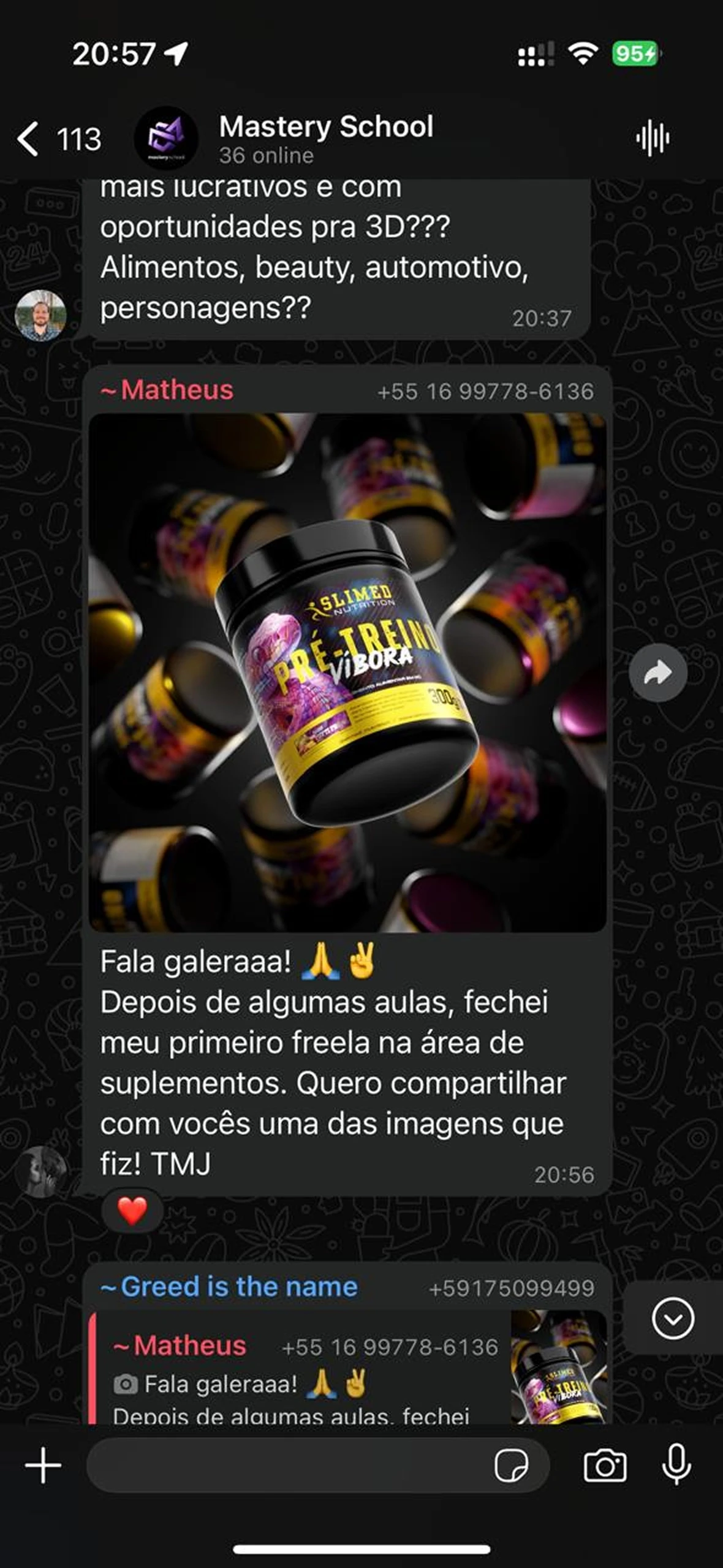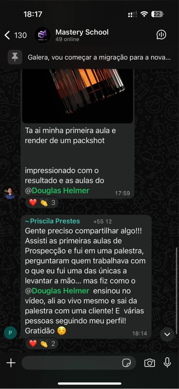 Comunidade de alunos no whatsapp e discord para fazer network, trocar experiências, tirar dúvidas, compartilhar projetos e o mais importante, ter acesso ao professor e vagas de freelas que são enviados.